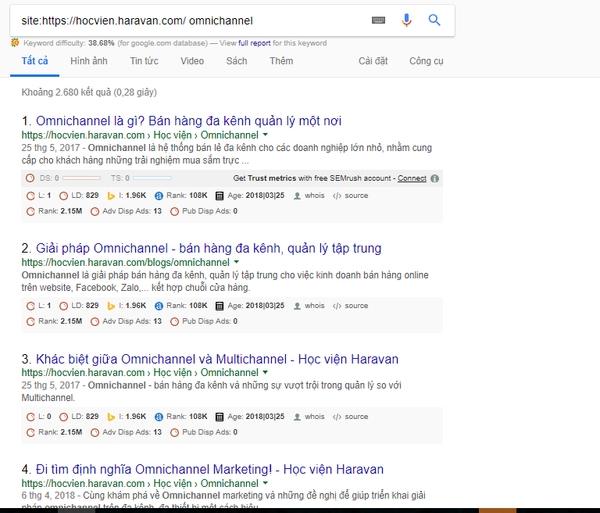Ví dụ tìm kiếm cho từ khóa liên quan đến omnichannel trên hocvien.haravan.com